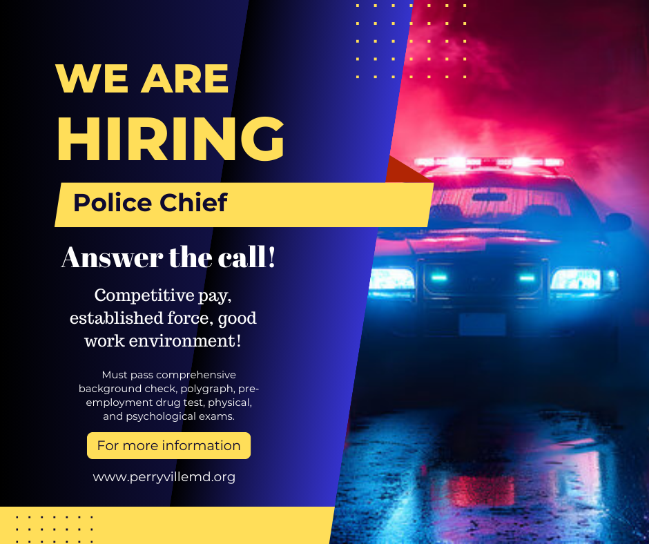 Send resume & salary requirements to Town of Perryville Attn: Police Chief Recruitment PO Box 773 Perryville, MD 21903 or FAX 410-642-6391.